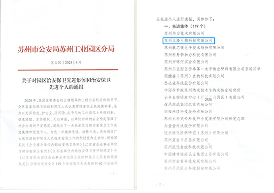 近日,蘇州市公安局蘇州工業園區分局關于園區治安保衛先進集體和治安保衛先進個人評選的結果出爐,蘇州天隆生物科技有限科技公司(以下簡稱“蘇州天隆”)憑借在安全管理中的突出表現,榮獲“園區治安保衛先進集體”榮譽。同時獲得該榮譽的還有蘇州華為、中科院蘇州納米所、企查查等單位。這一榮譽不僅是對公司長期以來安全管理工作的認可,更彰顯了企業在履行社會責任、保障區域安全穩定中發揮的積極示范作用。