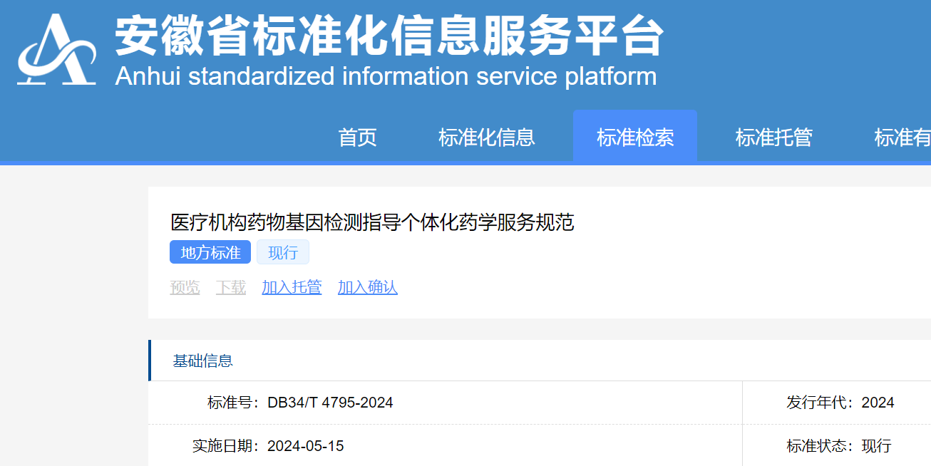近日,由安徽省市場監(jiān)督管理局批準發(fā)布的《醫(yī)療機構(gòu)藥物基因檢測指導個體化藥學服務規(guī)范》(下文稱“該標準”)已正式生效實施。該標準由中國科學技術大學附屬第一醫(yī)院(安徽省立醫(yī)院)提出并牽頭起草,安徽省第二人民醫(yī)院、安徽醫(yī)科大學第一附屬醫(yī)院、西安天隆科技有限公司、安徽康澤生物技術有限公司等單位參與起草,其中,中國科學技術大學附屬第一醫(yī)院(安徽省立醫(yī)院)藥學部史天陸主任藥師為該標準牽頭起草人。